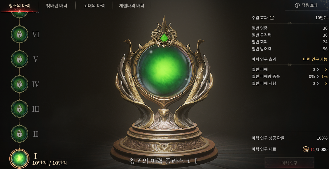 많은 분들이 초반에는 잘 안 챙기는 부분인데, 마력 연구는 꼭 하셔야 합니다. 던전(창조의 심연, 빛바랜 유산, 고대의 공방)과 아카이브에서 얻는 재료로 진행하면 전투력이 1~2천은 금방 오릅니다.